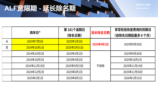 *如果周年日期是周末或公共假期,FSA将在随后的下一个工作日接受 ALF 申请,不会受到任何处罚,但这不会改变除名日期的计算或较低的恢复费用期限。